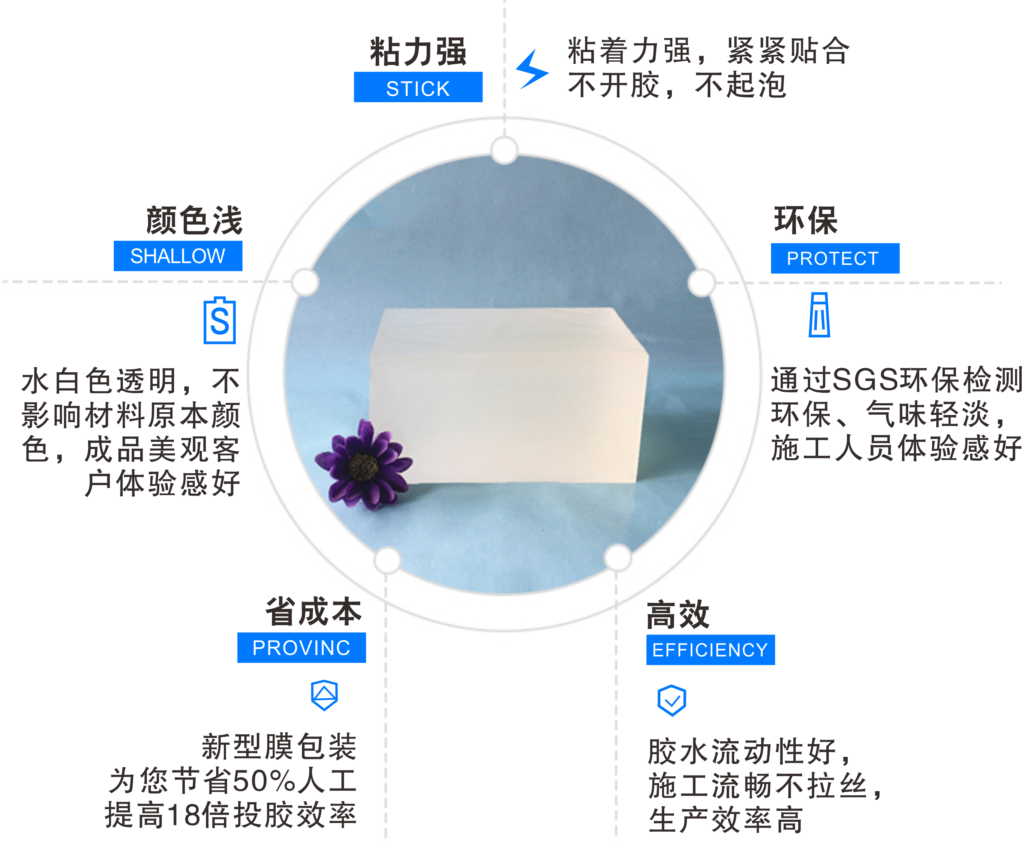 必威中文官网在产品上采用易熔膜包装, 无须人工剥纸, 使用时整块胶可以直接投入到热熔胶箱中使用, 产品使用性能无变化, 帮助您提高生产效率。